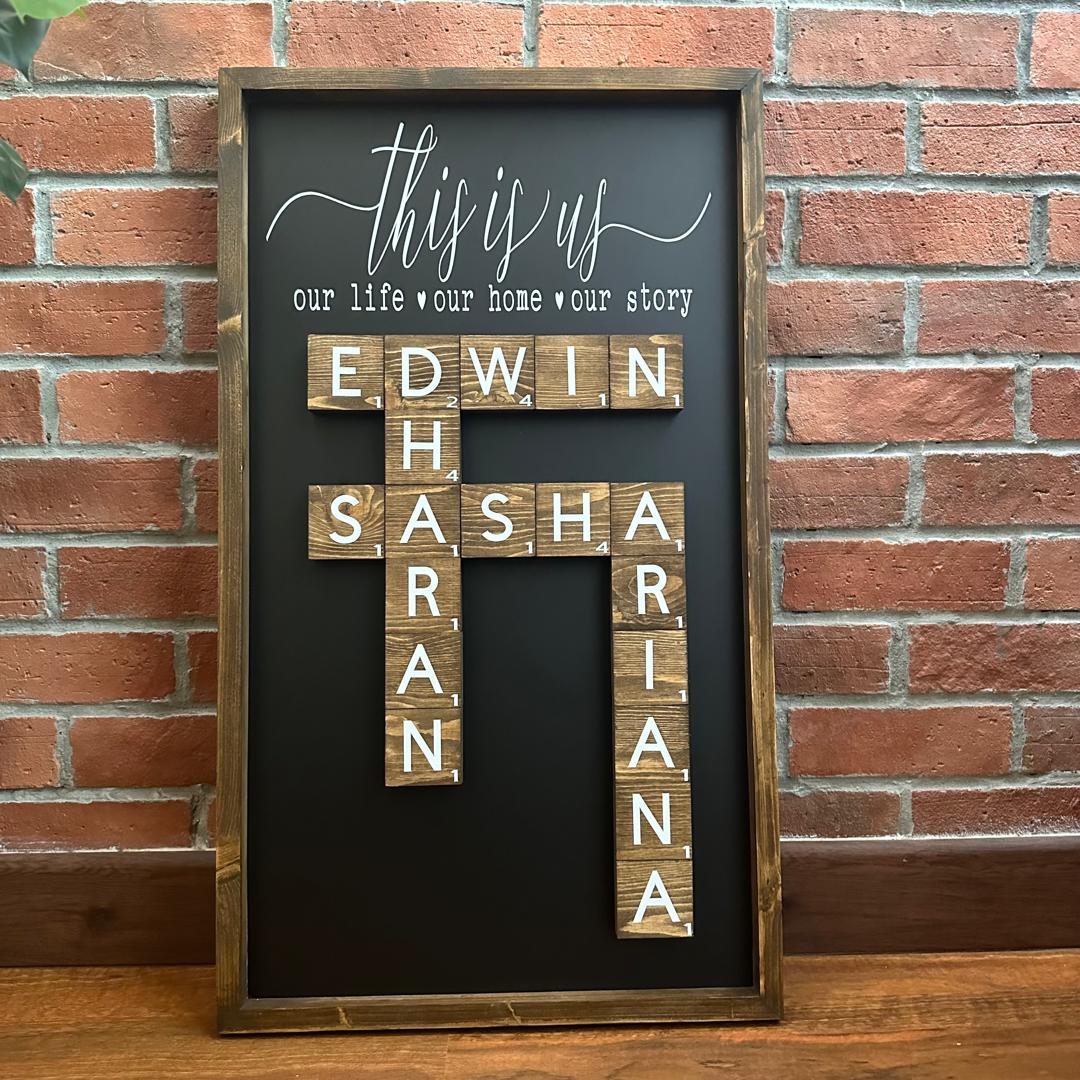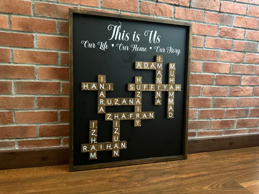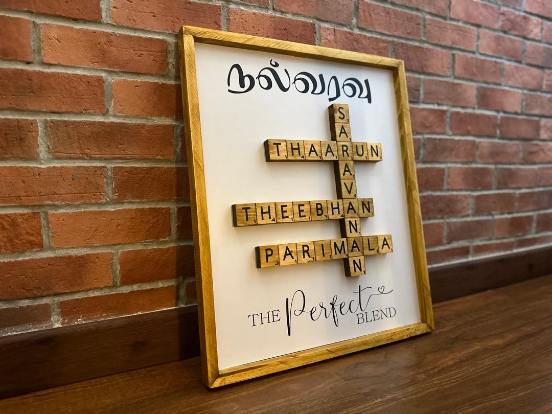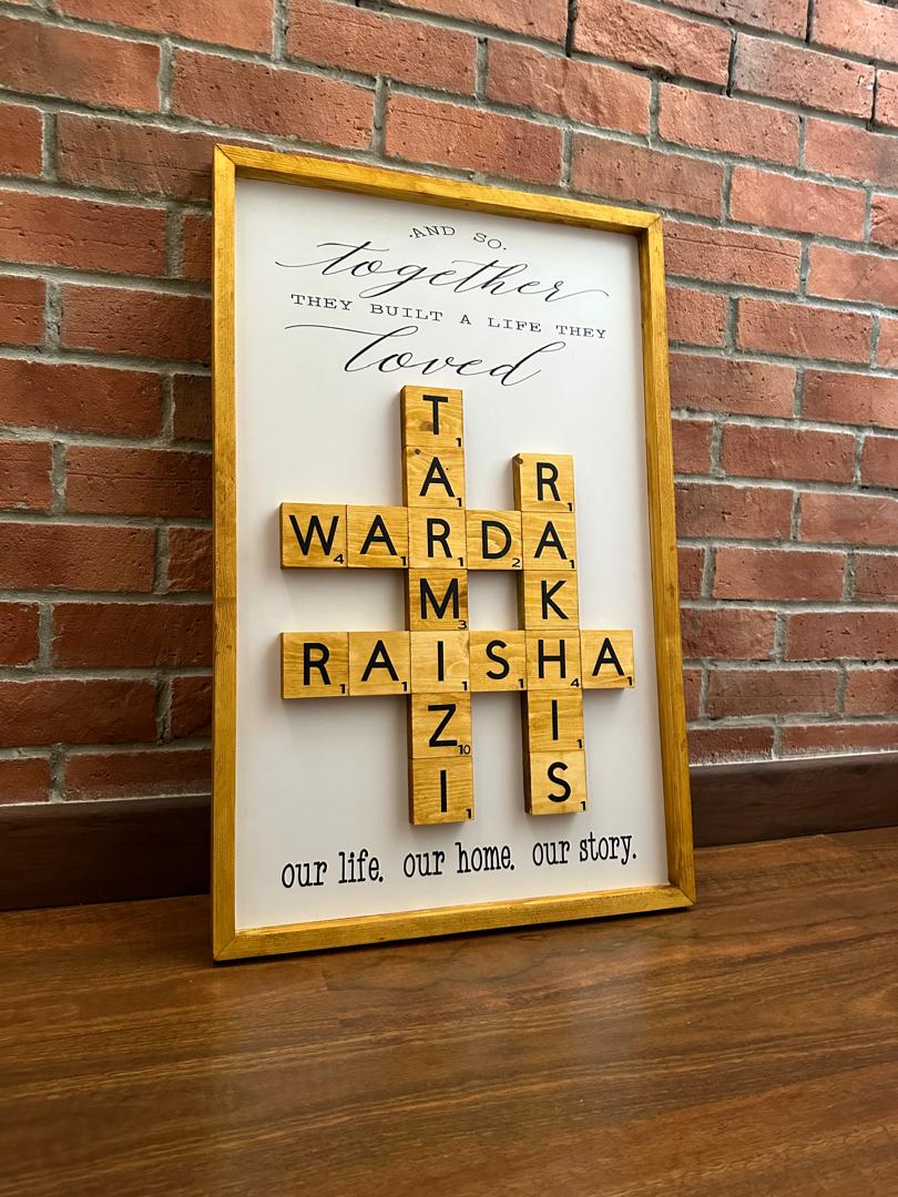 Celebrate your family bond with a Scrabble / Crossword style frame- handcrafted by Makers Maker Studio. Each piece features interlocking tiles representing the connection between your loved ones — perfect for gifts, weddings, or home décor